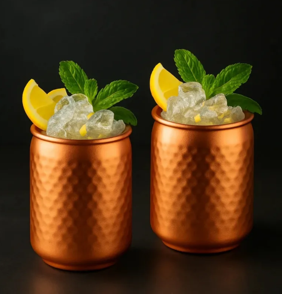 Vaso de cobre con acabado martillado, ideal para cócteles. Incluye bombilla metálico y ofrece un diseño elegante y duradero para disfrutar bebidas frías.