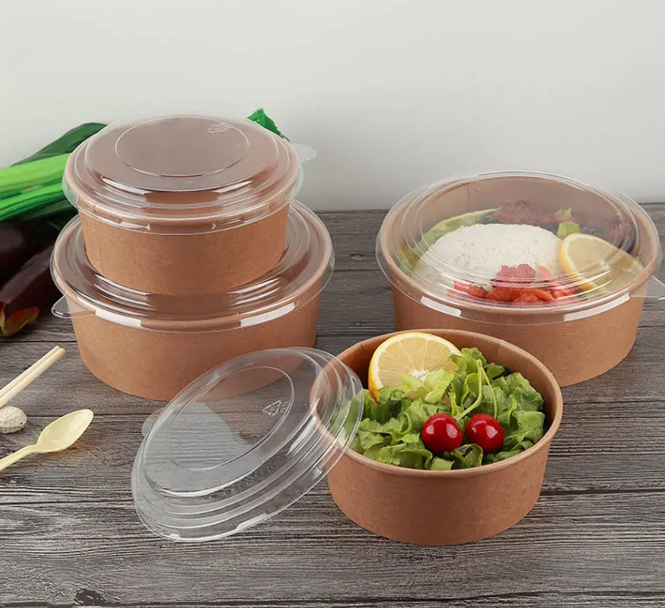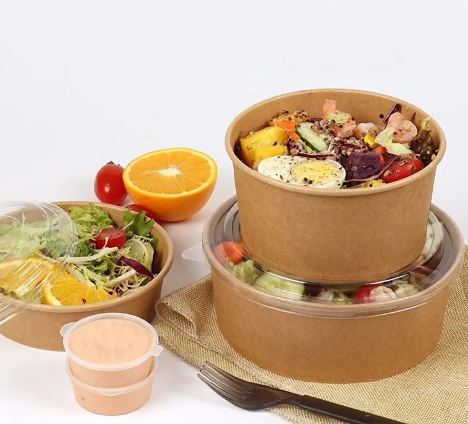 Envases de papel kraft con tapa plástica desechable, ideales para servir alimentos fríos o calientes. Con revestimiento anti grasa y anti agua, son perfectos para sopas, ensaladas, postres y más. Prácticos, seguros y listos para usar en restaurantes, eventos o para llevar.