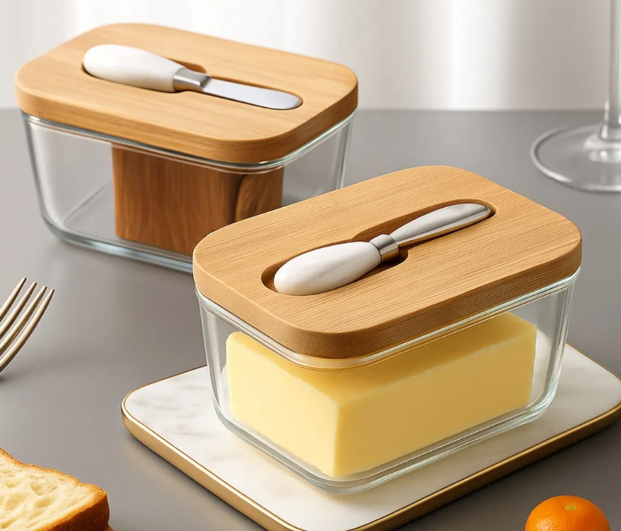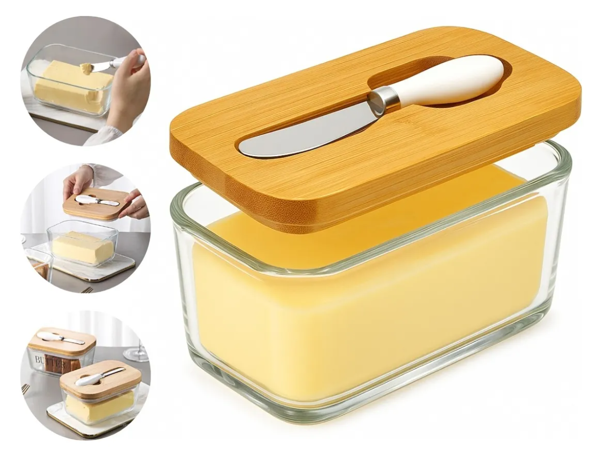 Mantequillero de vidrio con tapa de bambú ajustada y cuchillo de acero inoxidable. Capacidad de 600 ml, ideal para conservar la mantequilla fresca y lista para servir. Elegante, funcional y resistente, perfecto para dar un toque moderno a tu cocina.